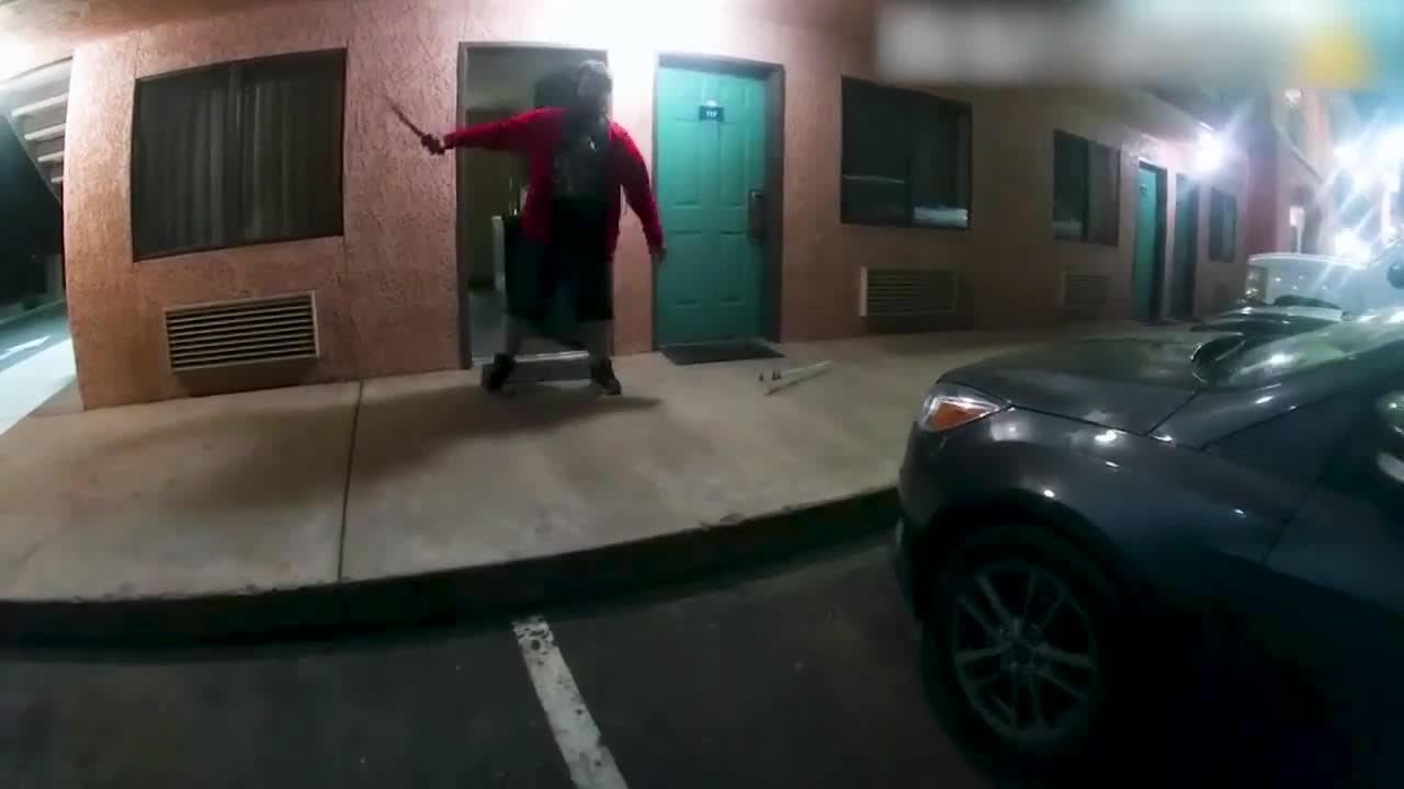 Newly released video shows the confrontation between a man who told deputies he was practicing his sword skills outside his Tucson motel room moments before he moved toward one of the officers and was fatally shot.