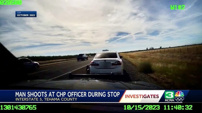 Newly released video of a California Highway Patrol traffic stop shows how dangerously close drivers on Interstate 5 in Tehama County came to being injured by gunshots.