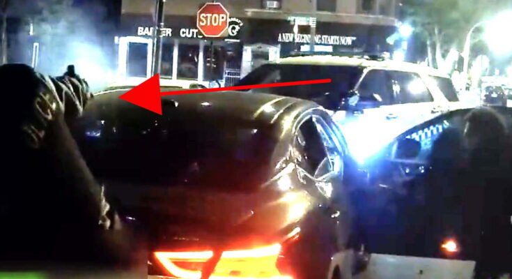 In the newly released footage, two squad cars block the suspectās vehicle and officers are seen loudly yelling and pulling on the carās door handles with their guns drawn. At one point, the officer who fires his weapon is seen rounding the back of the suspectās moving vehicle when a loud crash is heard, followed by the officer screaming in pain. He then fires about 11 rounds through the vehicleās rear window.