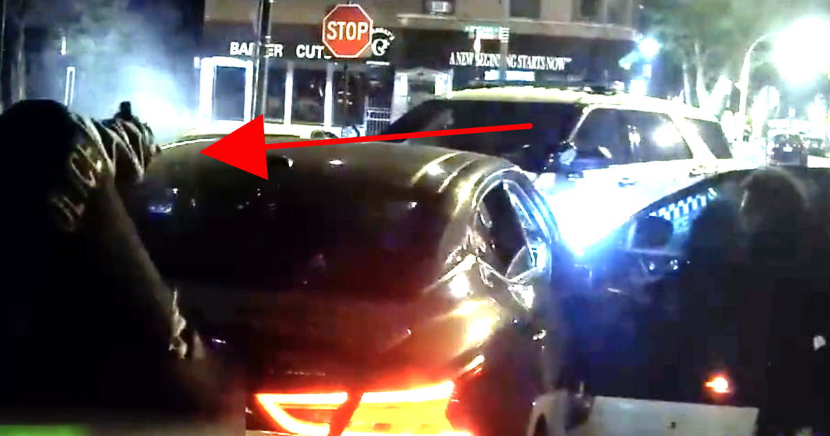 Dashcam footage shows officers removing two men from the front passenger side of the vehicle while a third person runs from the rear driver-side door and escapes.Ā