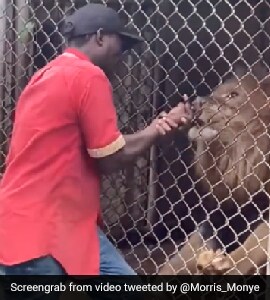 As shown in the viral clip, the contractor fits a part of his right hand through the galvanized chain link fence to pet a male African lion.