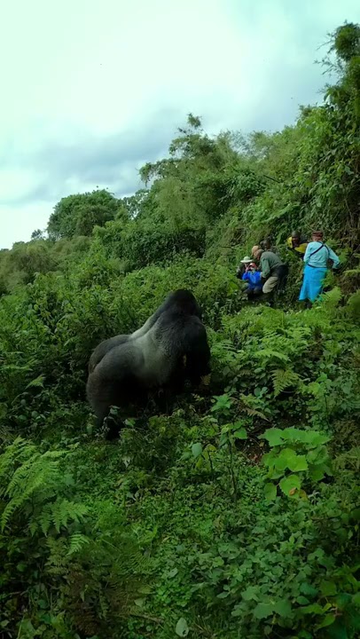 One tourist can be seen quickly moving out of the gorilla’s path, missing him by mere inches, before the silverback moves up the hill and into the deep undergrowth while making deep rumbling noises – a sign of contentment.