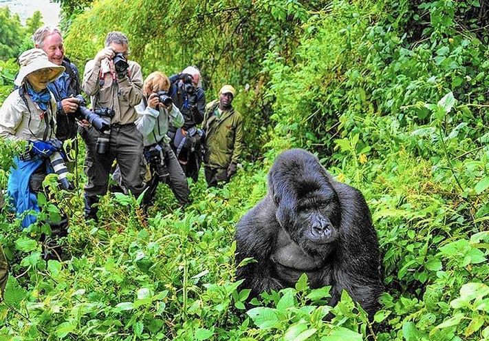 Another clip shows the silverback mountain gorilla, named Lisanga, moving back towards the tourists and sitting down in front of them before posing for pictures.