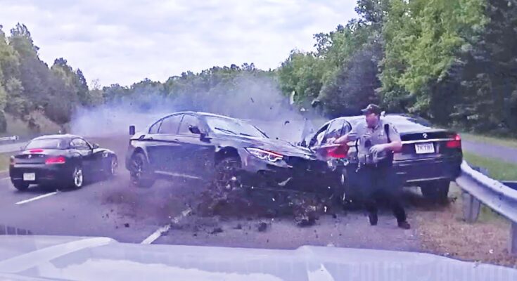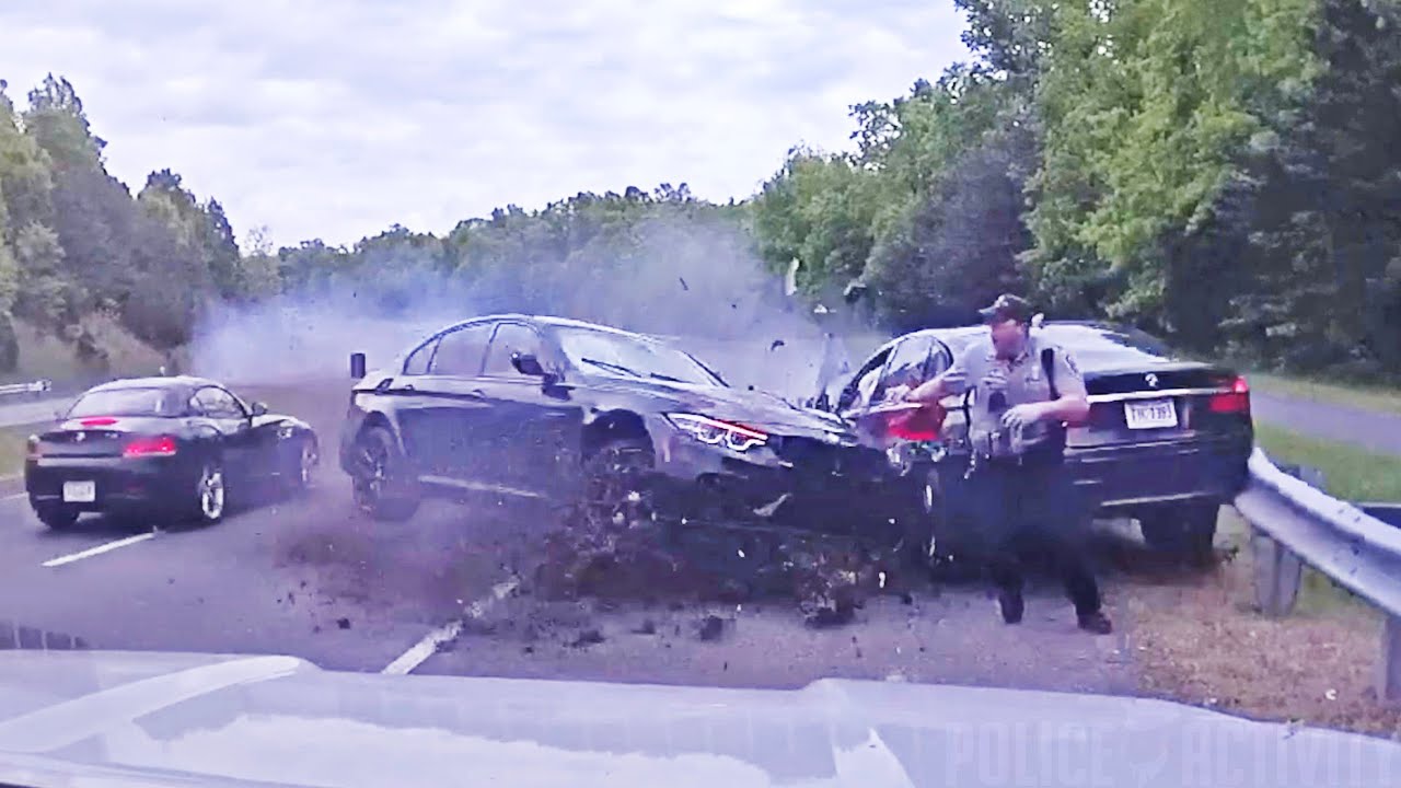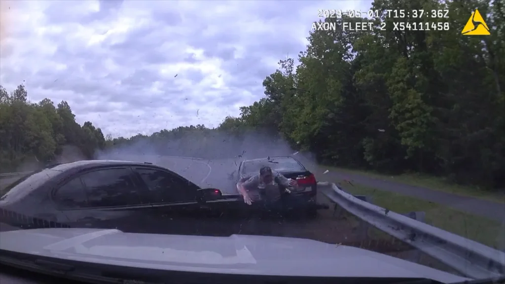The video, released by Fairfax County Police, shows a speeding car careening across multiple lanes onto the other side of the road and into a car stopped along the shoulder.