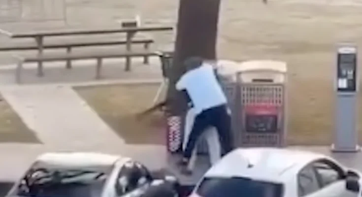 As the alleged gunman retreats, the bystander gently places the gun against a tree and puts his hand in the air.